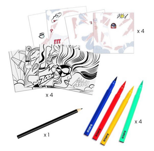 Djeco- Superhero Brush Pens and Rub On Transfers Kit