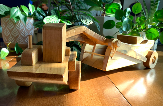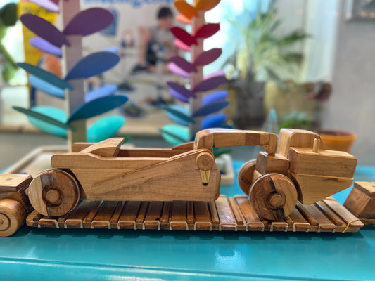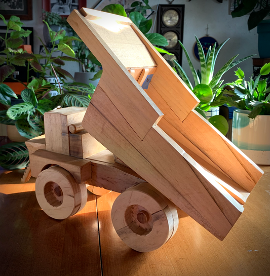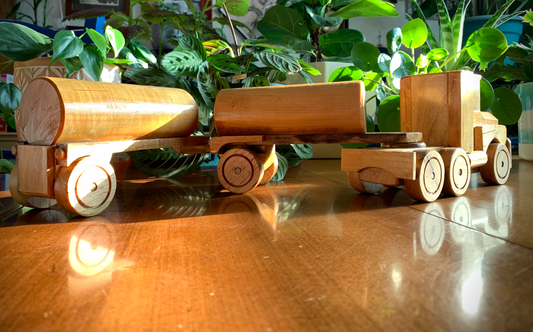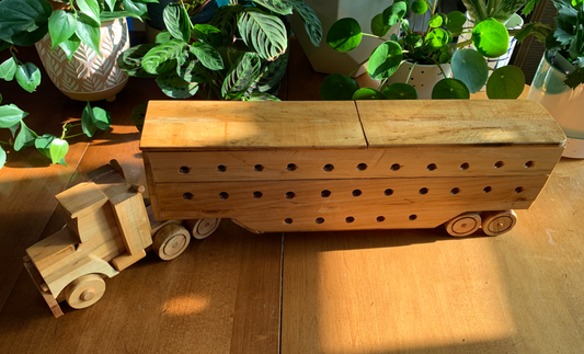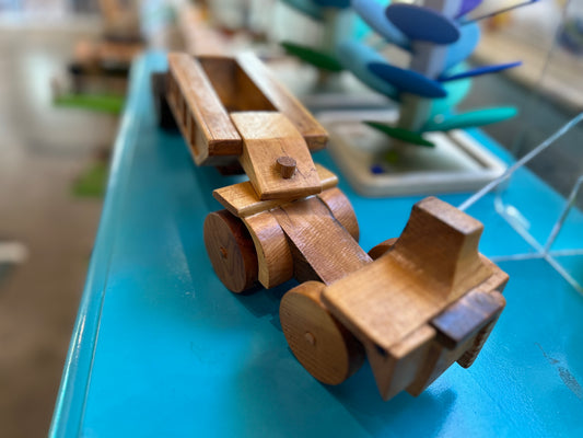 Artist and craftsman Vic Ward is a retired art teacher and sign painter, and the father of our own Erin Beedle. He's been making these wooden trucks for over 40 years- for little and big kids alike. Each one is unique- often made for a specific person in mind. You can find a variety of his moveable working trucks in store- from tow trucks to flat beds, log trucks (with real logs!) to bull haulers!