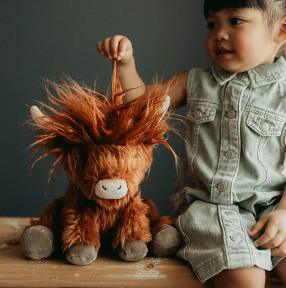 Say hello to Hamish the plush Highland Cow, a cuddly companion from the coziest countryside! With burnt orange fur that’s soft and shaggy, a charming tuft atop his head and at the end of his tail, Hamish is full of farmyard flair.