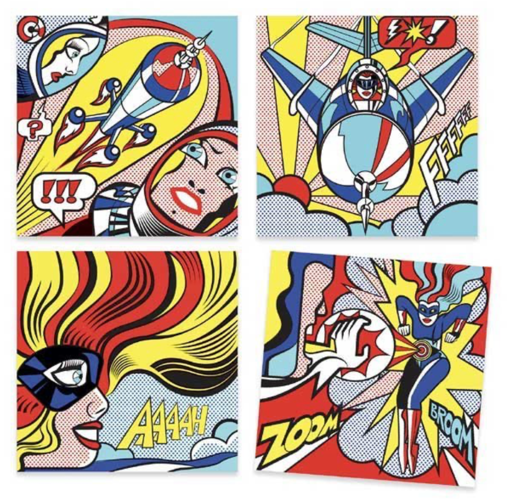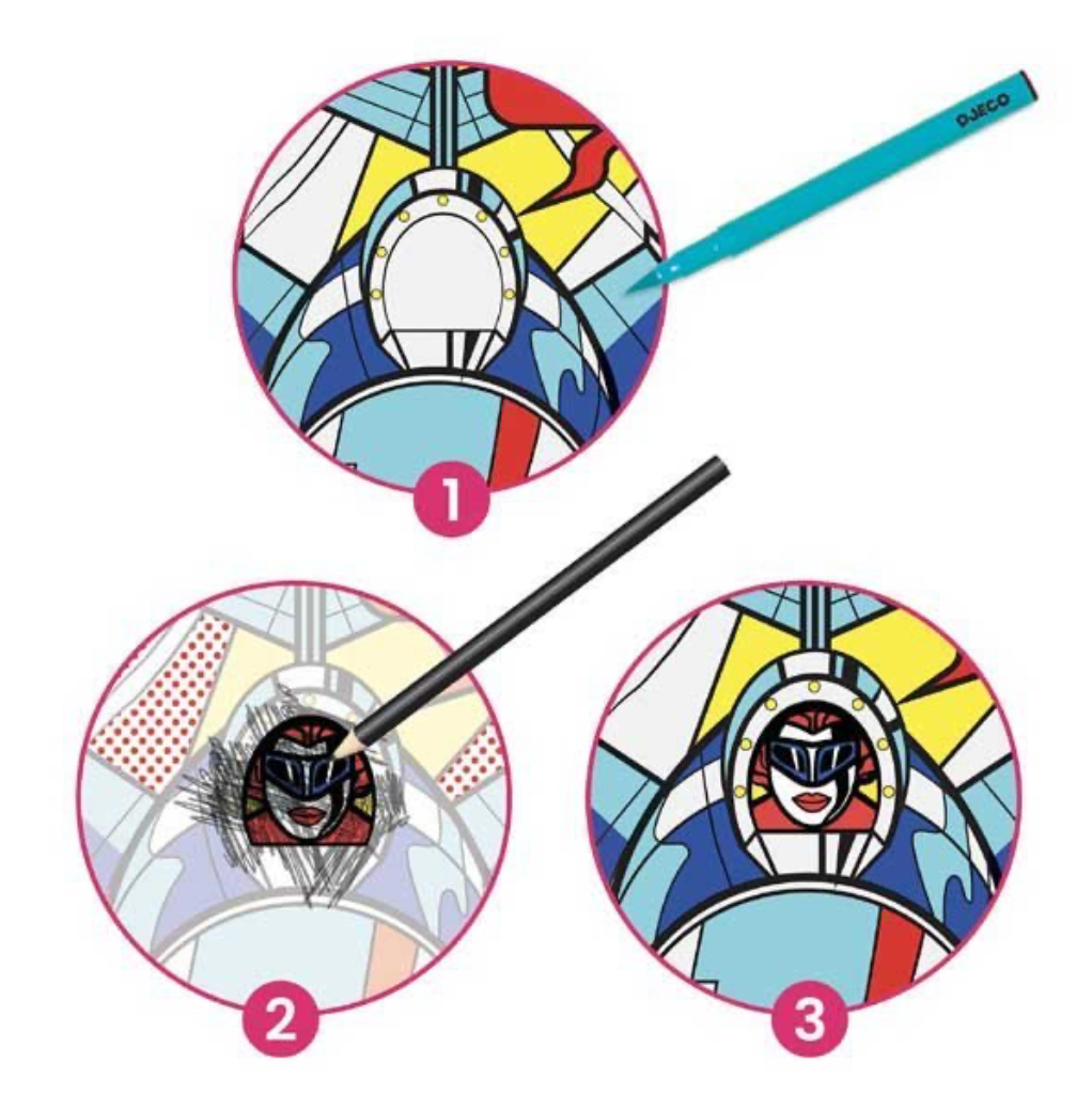 A coloring and transfer activity that invites you to discover the style of Roy Lichtenstein, the great master of Pop Art. Gradually, the paintings are colored using felt-tip brushes. Then the transfer boards make it possible to add details and polka-dot wefts so characteristic of the artist's work. Scenes come to life!