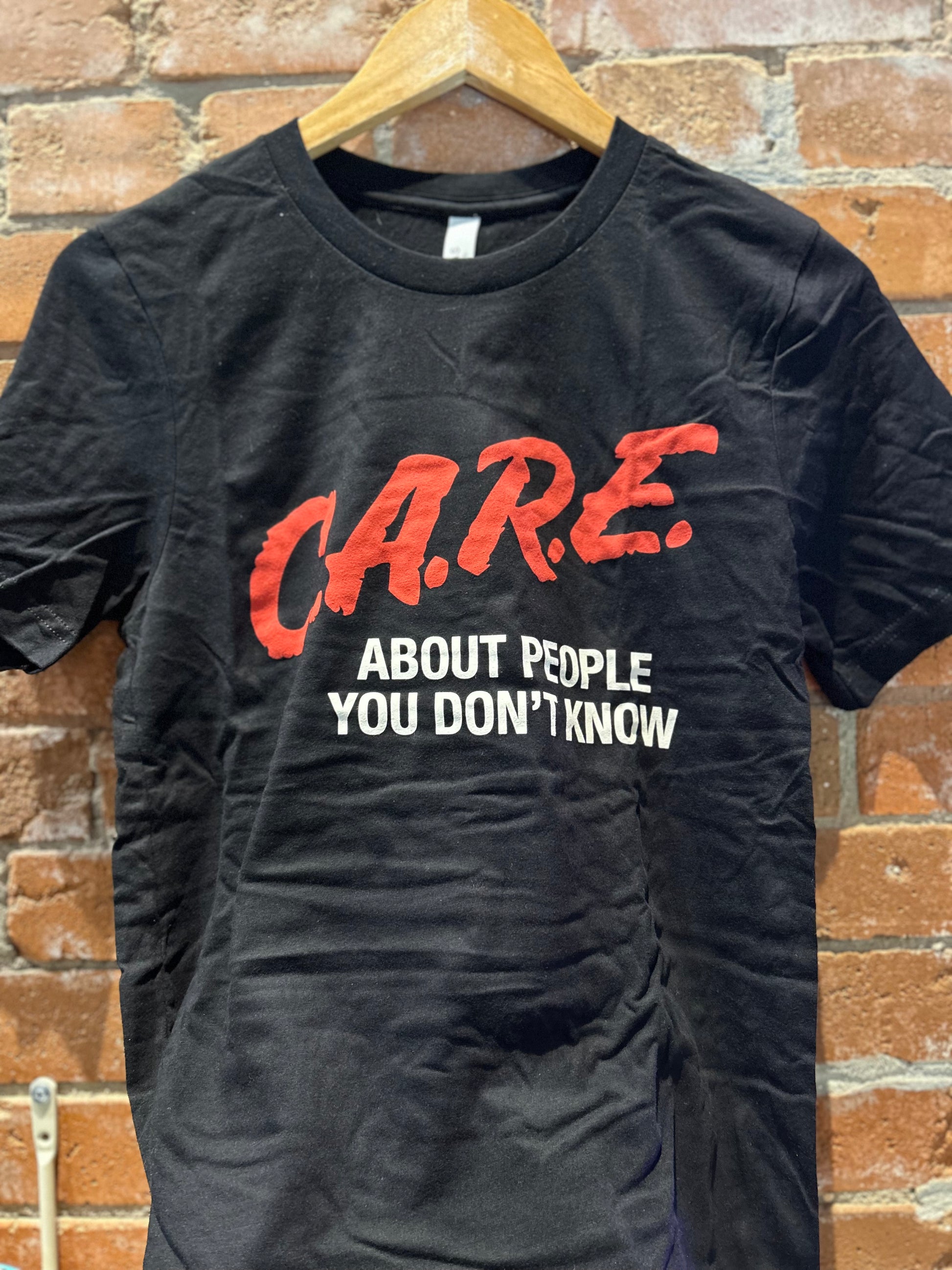 T-shirt with "C.A.R.E. About People You Don't Know" logo, Red text on black shirt. Unisex sizing. 100% Cotton.