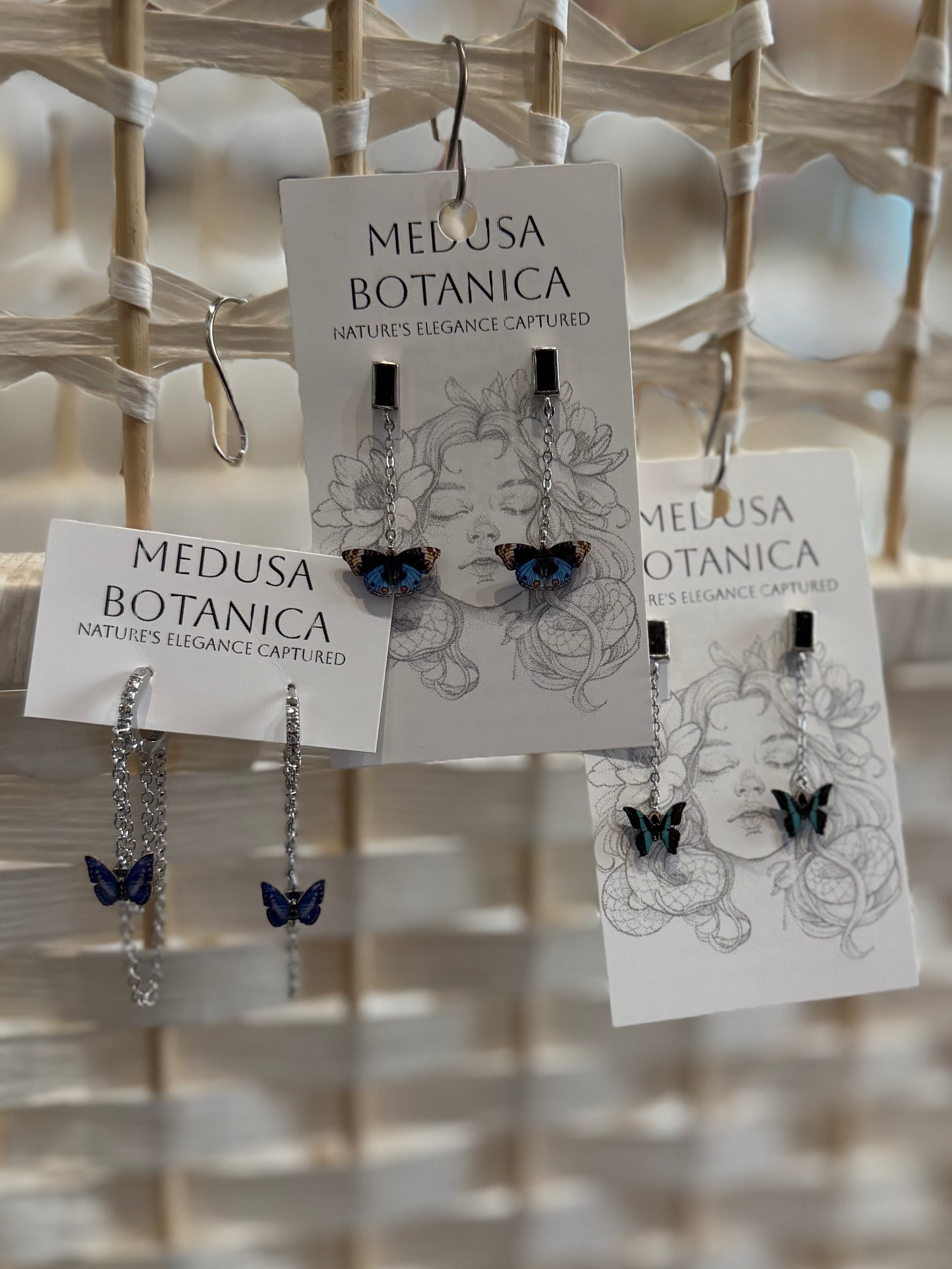 One of a kind Earrings, using handcrafted paper butterflies and .925 sterling silverand specimens. Made by Colorado Springs artist Elisia Smock