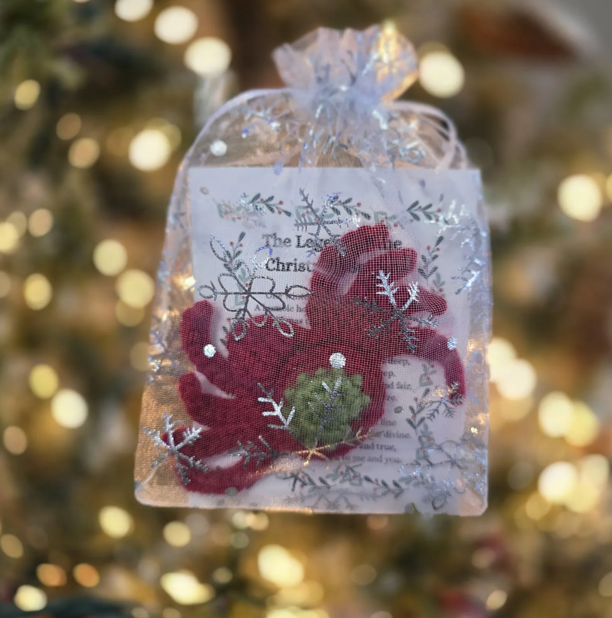 Each handmade crochet spider is about 2 inches tall and 4 inches wide, perfectly sized to perch on a branch or nestle in a stocking. It arrives tucked in an organza gift bag, along with a printed copy of the Christmas Spider poem, because we’re classy like that.